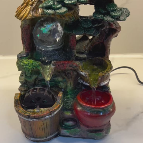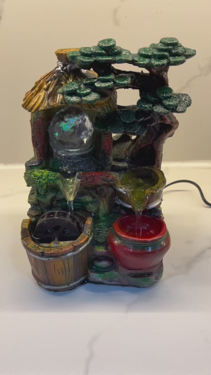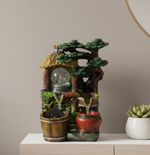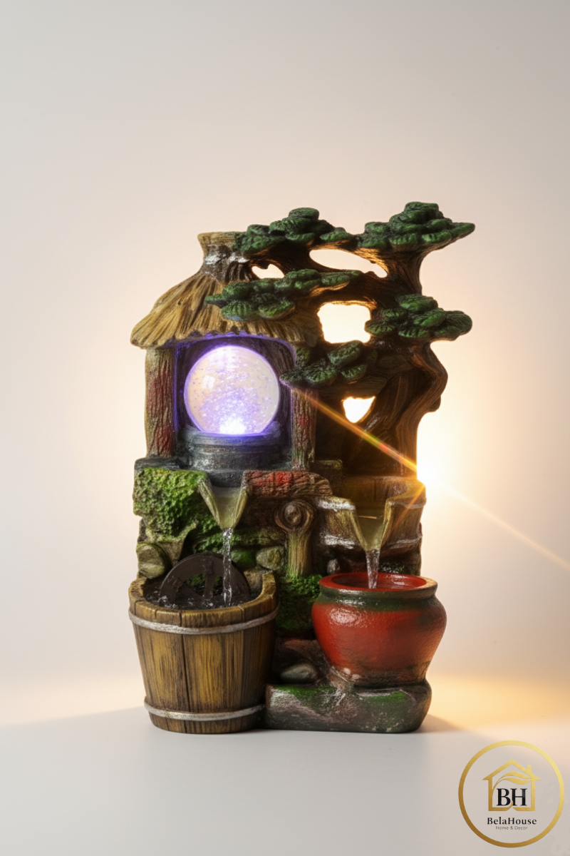 Perfecta para salas, terrazas cubiertas, entradas o zonas de descanso, esta fuente no solo decora, sino que también genera un suave sonido de agua en movimiento, ideal para promover la relajación y el equilibrio dentro de tu hogar.